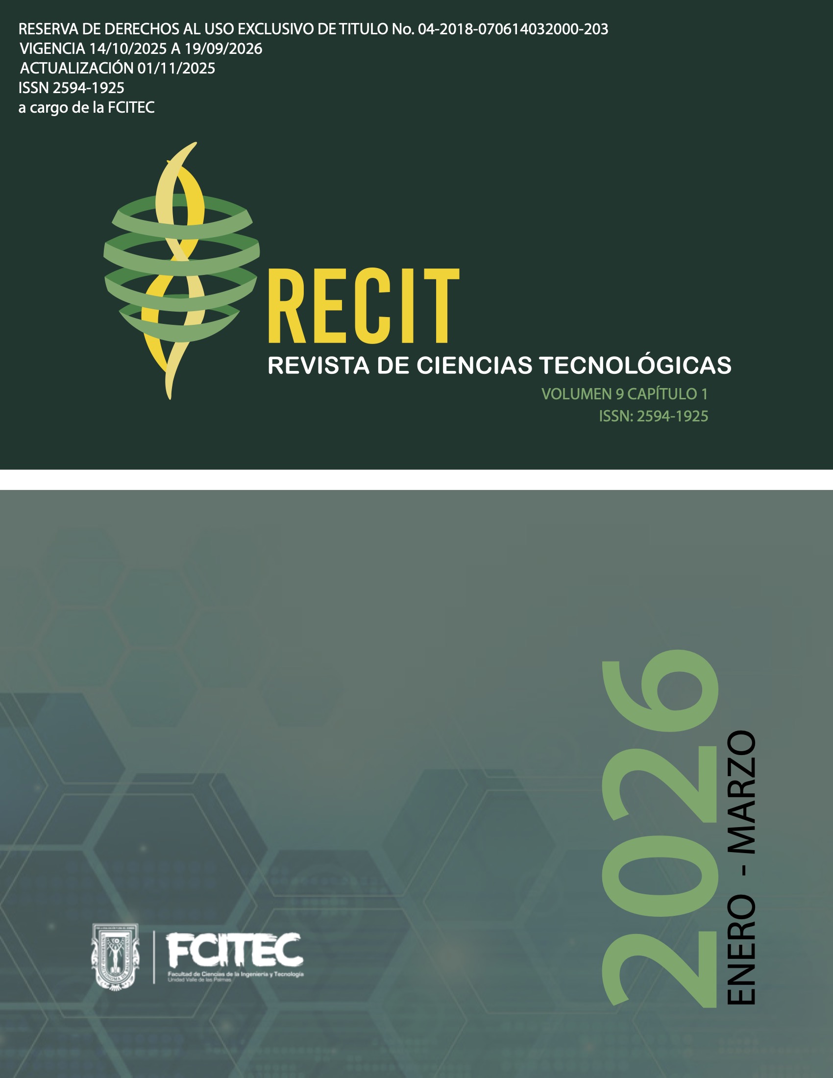 Research articles -Predictive modeling of carbon monoxide emissions using deep learning and environmental features from a Mexican border city -Chemical and Thermal Characterization of an exopolysaccharide from Lactiplantibacillus plantarum BAL-29-ITTG Review articles -Artificial intelligence and fermentation: applications, publications, and trend analysis -Comparative review of rehabilitation exercise for the lumbar region in individuals with musculoskeletal disorders Case studies -Analysis of the main factors involved in the 4.0 industry implementation process